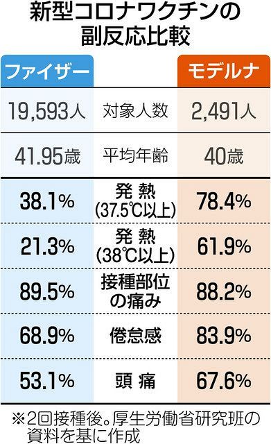 厚生労働省の研究では、モデルナ接種後に発熱した人の割合はファイザー接種後の2~3倍に上ると判明。